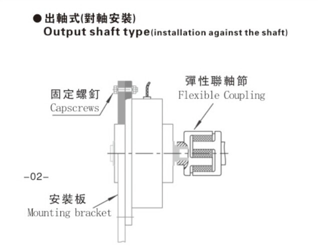 在安裝單軸磁粉制動器的時候,請將托架嵌合入安裝板并固定好,必須使用彈性聯(lián)軸器連接制動軸和負(fù)載軸,且此時軸間的同同心度、直角度等必須控制所使用彈性聯(lián)軸節(jié)的允許范圍以內(nèi)。安裝尺寸規(guī)格圖上如下: