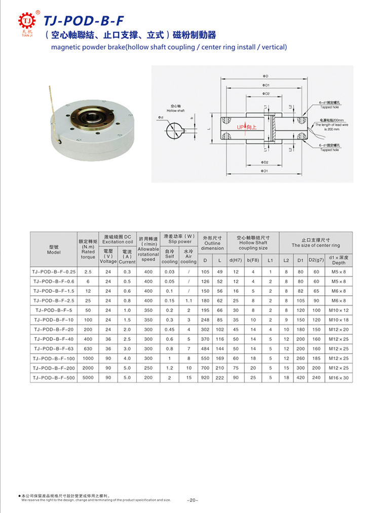 臺灣天機牌該型(TJ-POD-B-F)中空軸、自冷式磁粉制動器是一款內(nèi)殼旋轉(zhuǎn)磁粉制動器(剎車器),散熱方式為自然冷卻,與其他的型號比較就是其外形比較獨特、超薄,減少安裝空間。具有安裝容易、使用壽命長、節(jié)省安裝空間、可輕松進(jìn)行大范圍的控制等特點,適用于放卷、轉(zhuǎn)矩控制、材料放卷、負(fù)載及其他等多用途。