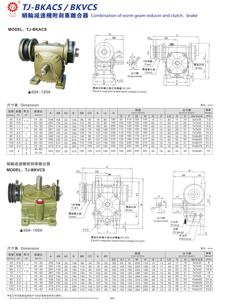 天機(jī)傳動該型離合剎車減速機(jī)(BKDCS型)由鑄鐵式蝸輪蝸桿減速機(jī)與一個摩擦式電磁離合器(下稱離合器)附V型皮帶輪,可雙槽或者單槽,及一個電磁制動器(下稱制動器)組成。離合器與制動器各裝置在減速機(jī)的輸入兩端,當(dāng)一邊通電的時候,另一邊就要斷電,注意:兩個不能同時電。