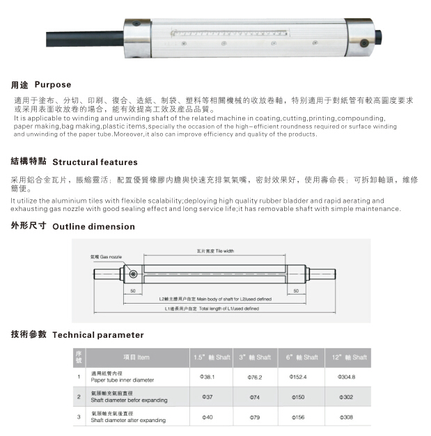 天機(jī)傳動(dòng)廠家生產(chǎn)的瓦片式氣脹軸又稱板條式氣脹軸,由氣脹軸(氣漲軸)和長(zhǎng)條脹瓦兩部分組成。瓦片式氣脹軸采用鋁合金板條,具有經(jīng)濟(jì)效率高、承載量大、紙管放置簡(jiǎn)單、充氣時(shí)間短、可拆卸軸頭、保養(yǎng)維修簡(jiǎn)便等等優(yōu)點(diǎn)。